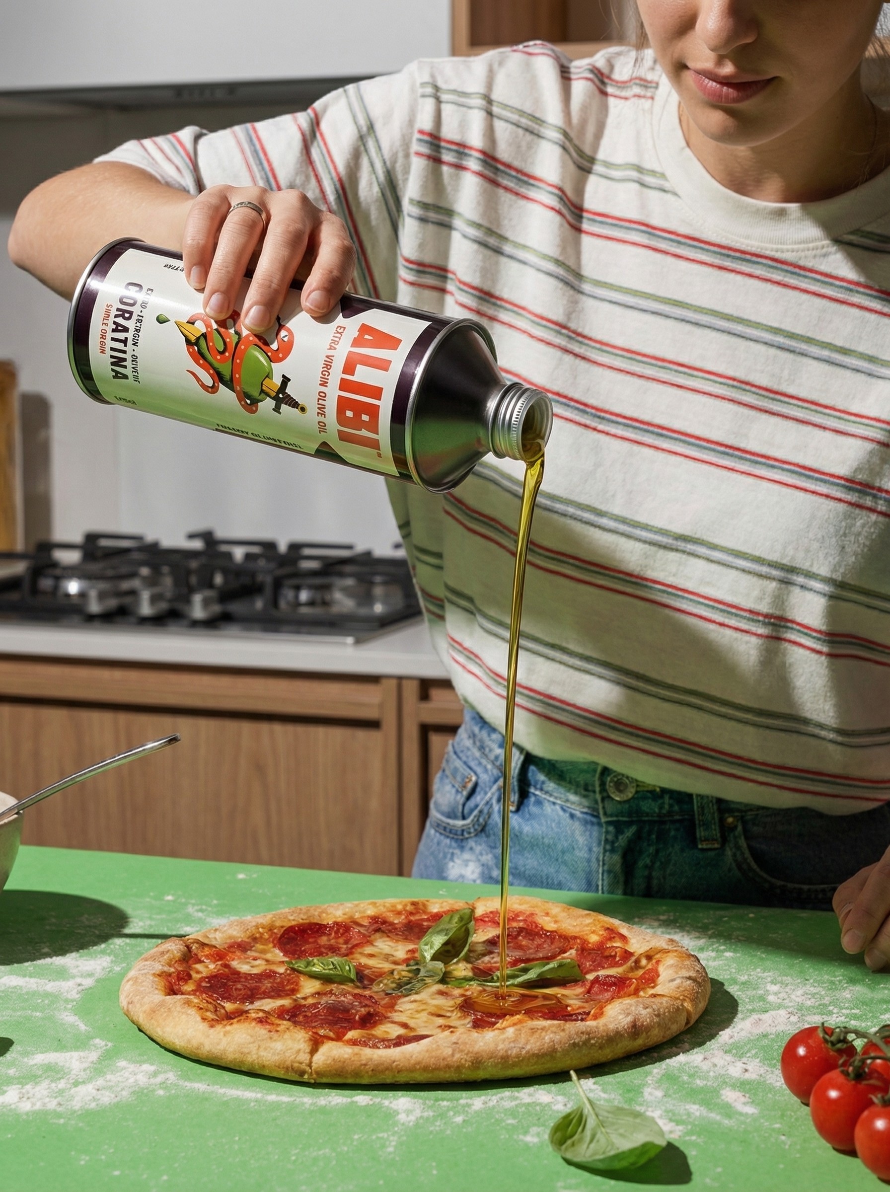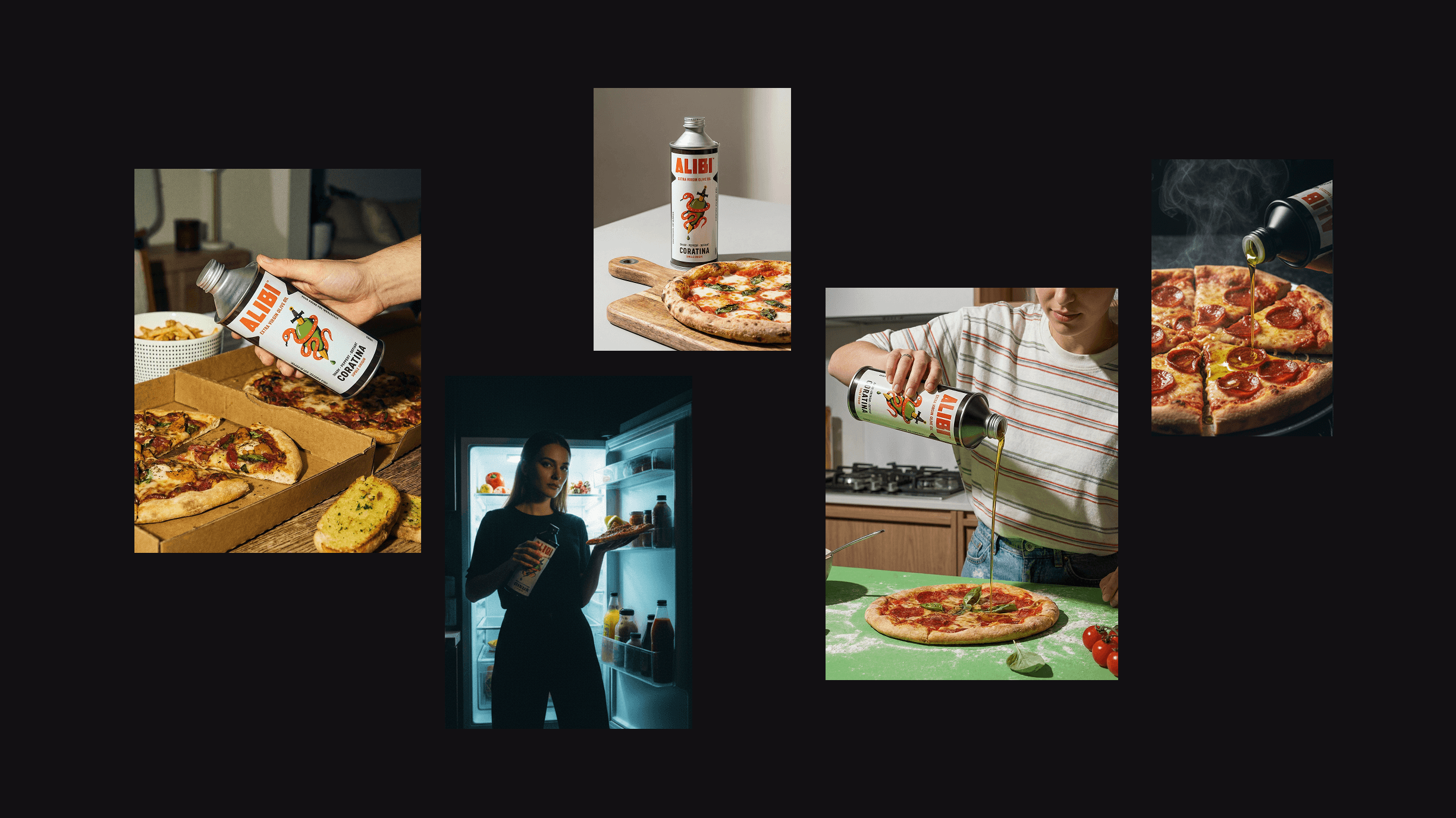 Alibi is a single-origin extra virgin olive oil from Puglia — built around the idea that good olive oil should feel like contraband, not a health food. The brand identity leans dark: noir, bold, unapologetic.